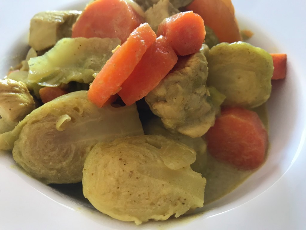 - Lorsque tout est cuit, ajouter le lait de coco ainsi que le curry, le sel et le poivre.