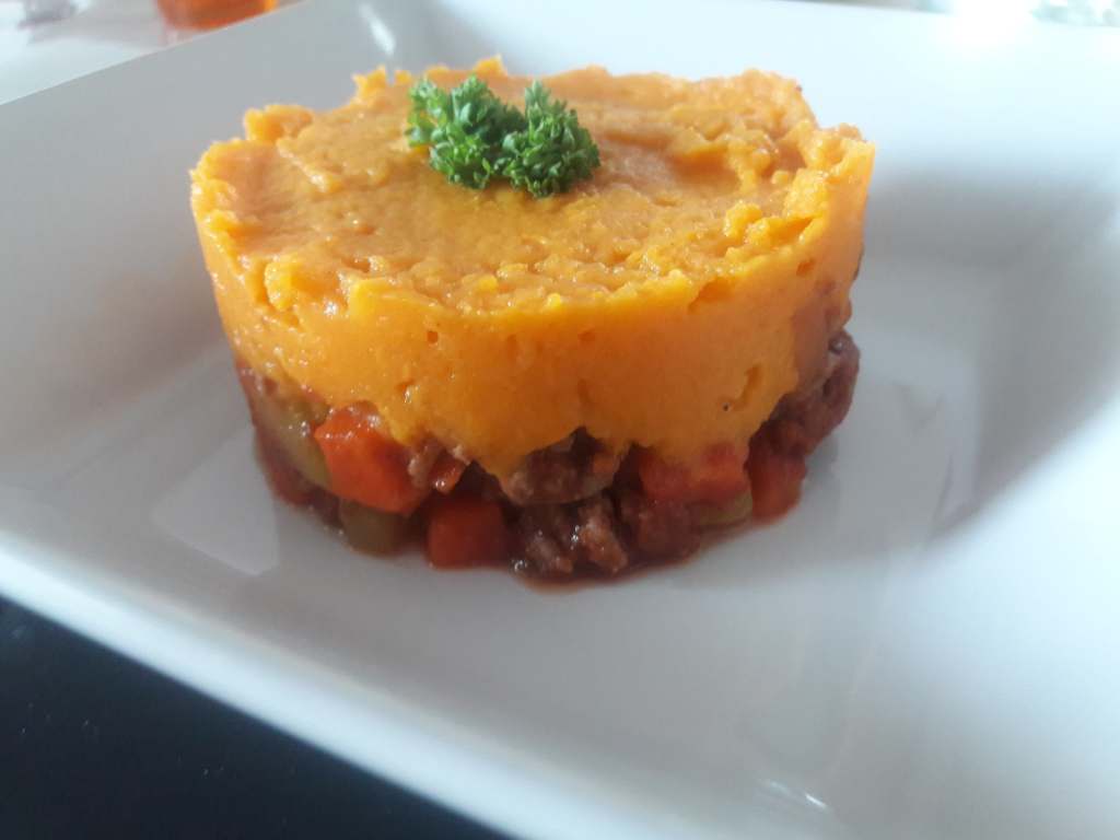 - Mettre le mélanger viande hachée/courgette/carotte/tomate dans le fond d’un plat et recouvrir de la purée.