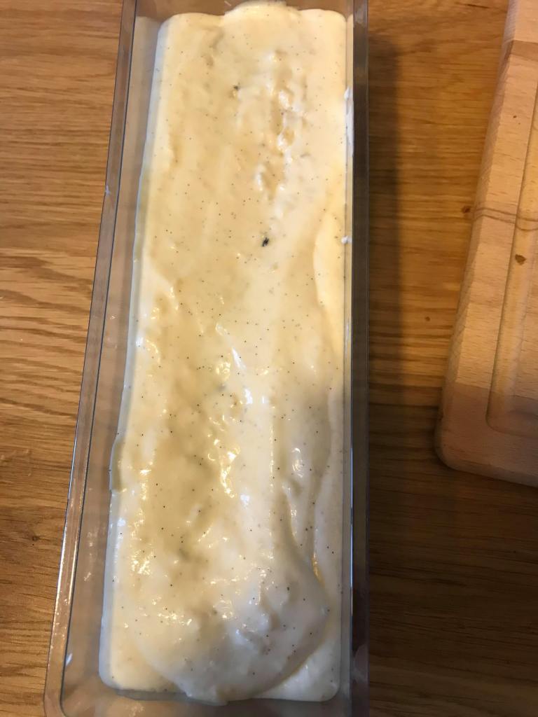 Mettre une première couche de mousse vanille dans le fond du moule à buche (environ 3cm d’épaisseur)