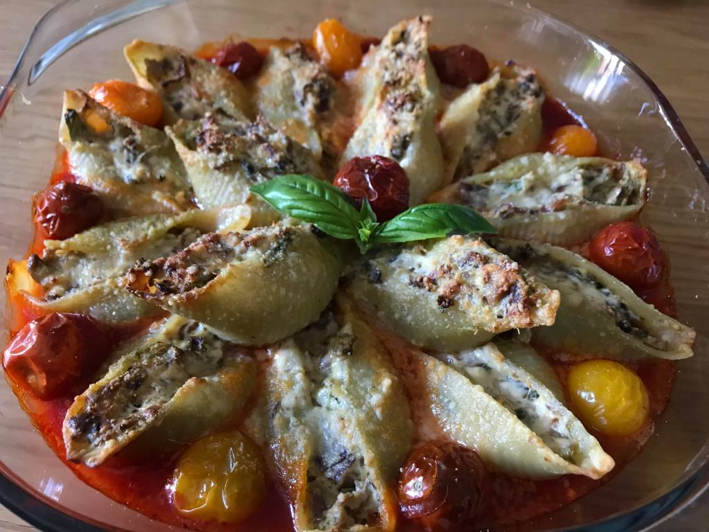 Mettre dans le fond de vos conchiglionis un peu de pesto et recouvrir avec une cuillère à soupe de farce et disposer dans votre plat. Répéter l’opération avec le reste des pâtes. Disposer les conchiglioni sur la sauce tomate, saupoudrer de parmesan et enfourner pour 20 minutes à 180°c.