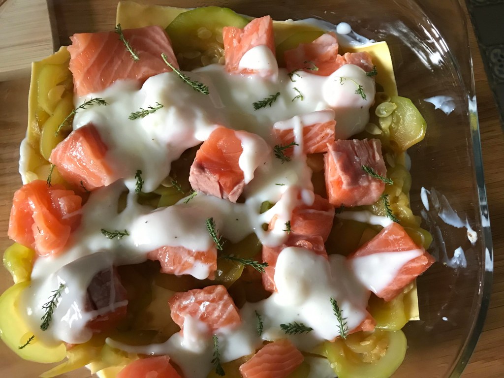 Dans votre plat à lasagne, commencer par mettre une couche de béchamel, recouvrir de pâte, déposer une couche de courgettes, des morceaux de saumon, 2 cuillères à soupe de citron, de l’aneth et un peu de béchamel.