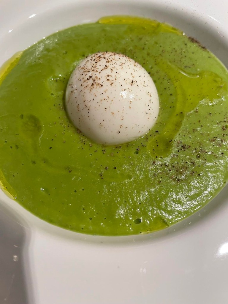 Mettre le velouté dans les assiettes de service. Mettre un peu d’huile d’olive dans chaque assiette.