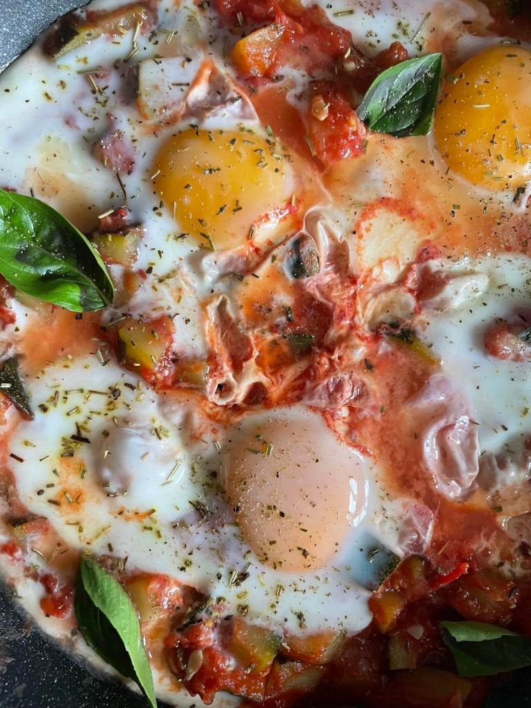 Casser les oeufs directement dans la poêle et laisser mijoter sous couvert jusqu’à ce que les oeufs soient cuits. Poivrer et ajouter les feuilles de basilic en fin de cuisson.