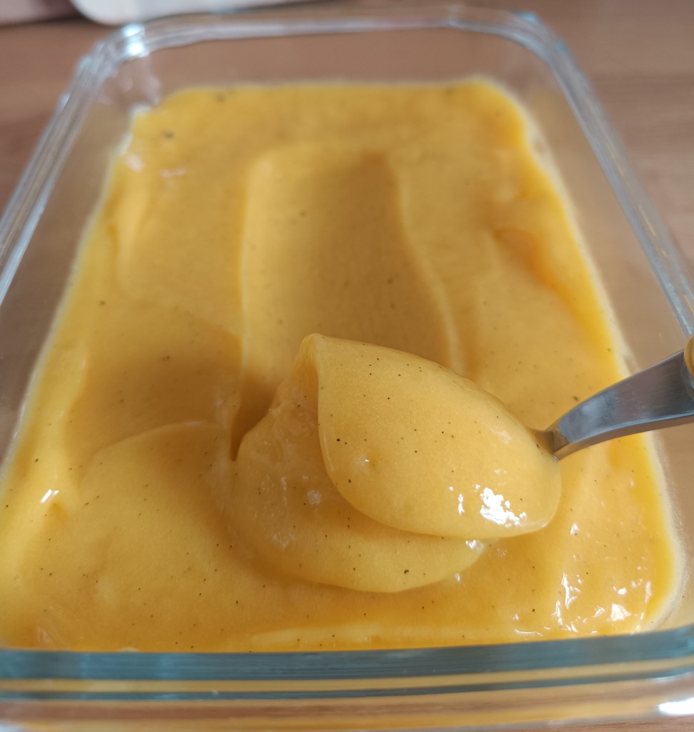 Mettre les morceaux de mangue congelée dans un mixeur. Mixer jusqu’à l’obtention d’une crème glacée. (mixer jusu’à l’obtention d’une texture crémeuse). Ajouter les grains de vanille, puis mixer 30 secondes.