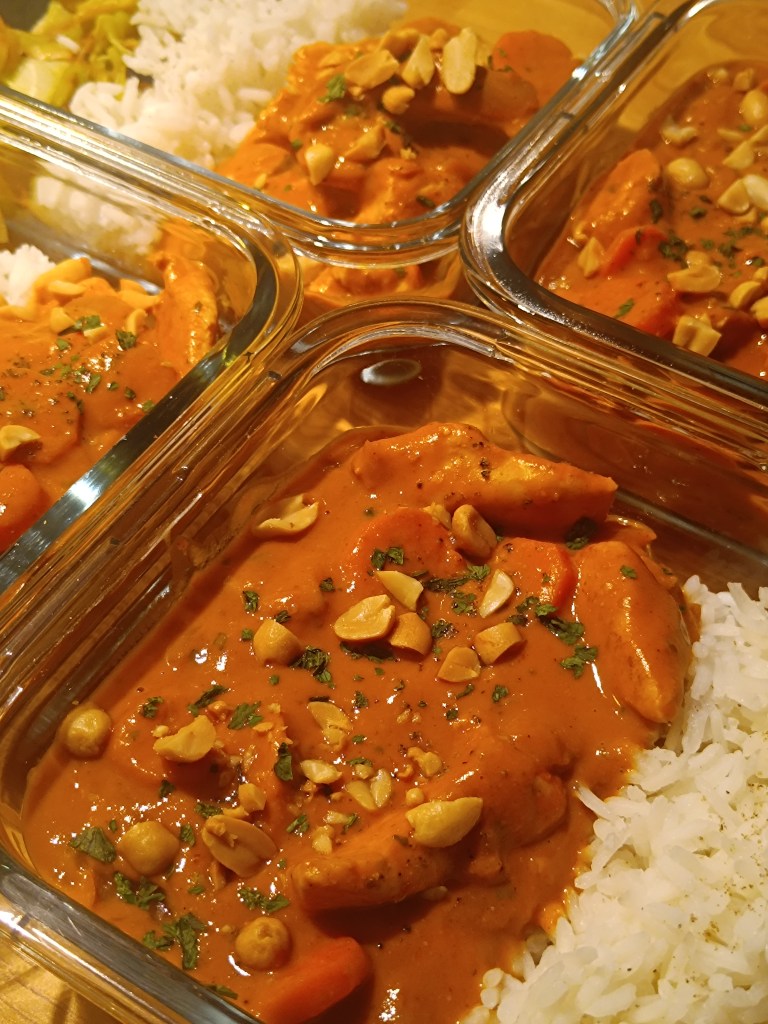 Laisser mijoter sous couvert 5 minutes puis ajouter le beurre de cacahuètes. Bien mélanger et laisser mijoter sur feu doux pendant 15 minutes, ajouter un peu d’eau si besoin.