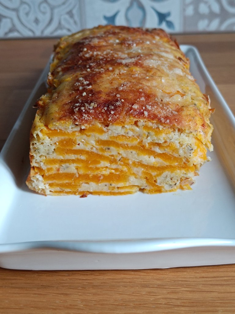 Éplucher et couper la courge butternut en tranches très fines. Cela est important pour le côté “invisible” du gâteau avec de fines couches de courge. Incorporer ensuite les tranches de courge dans la pâte, en les mélangeant soigneusement pour bien les imbiber. Il est également possible de cuire au four la courge entière 45 minutes et de réaliser les tranches après cuisson.