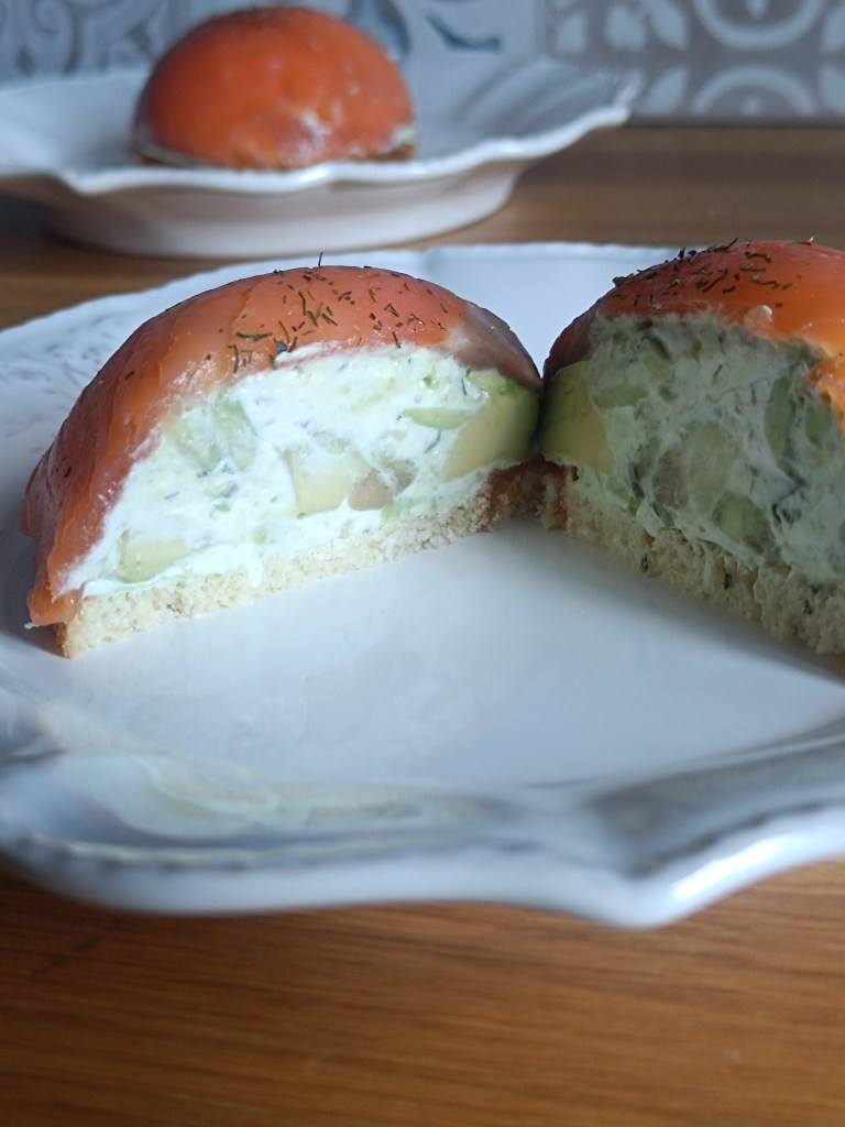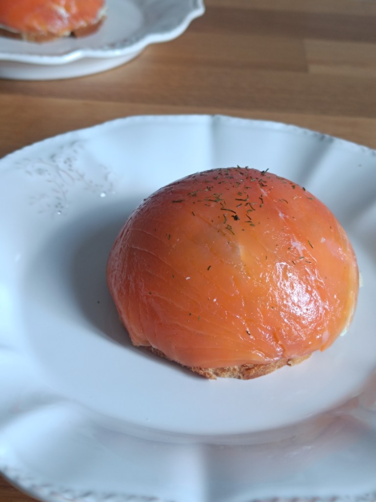 - Dans un moule à dômes, placer 1 tranche de truite fumée dans un dôme et répéter l’opération dans un autre dôme. Mettre un peu de citron dessus.