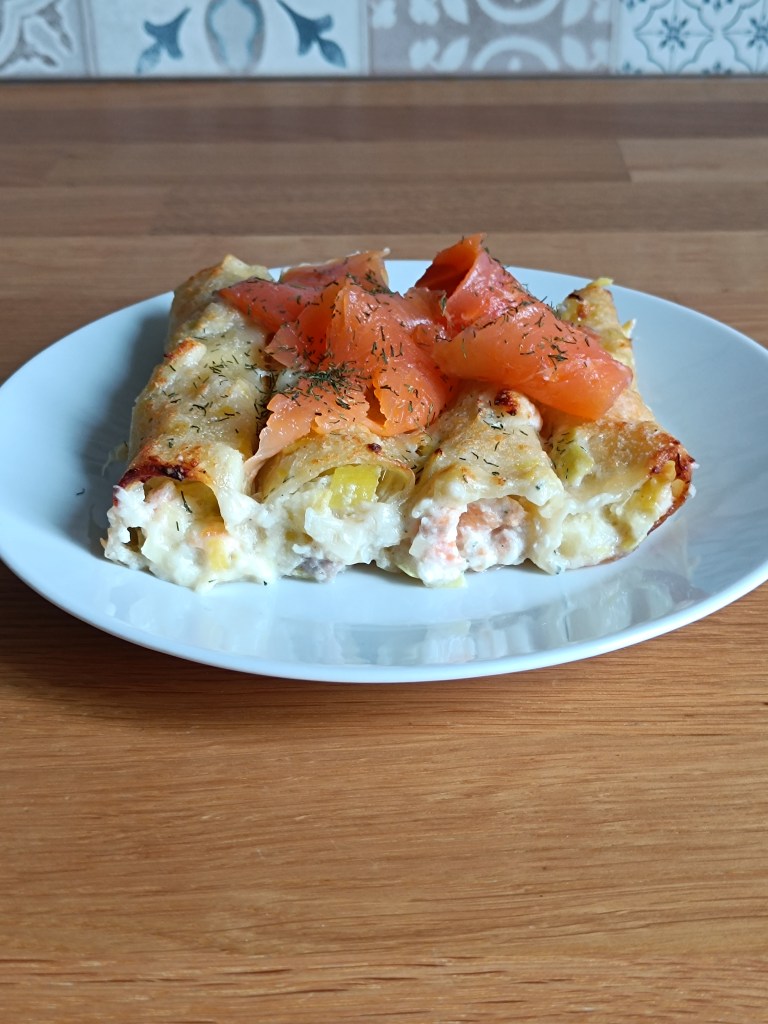 - Déposer une tranche de truite fumée sur les cannellonis de chaque convive et déguster.