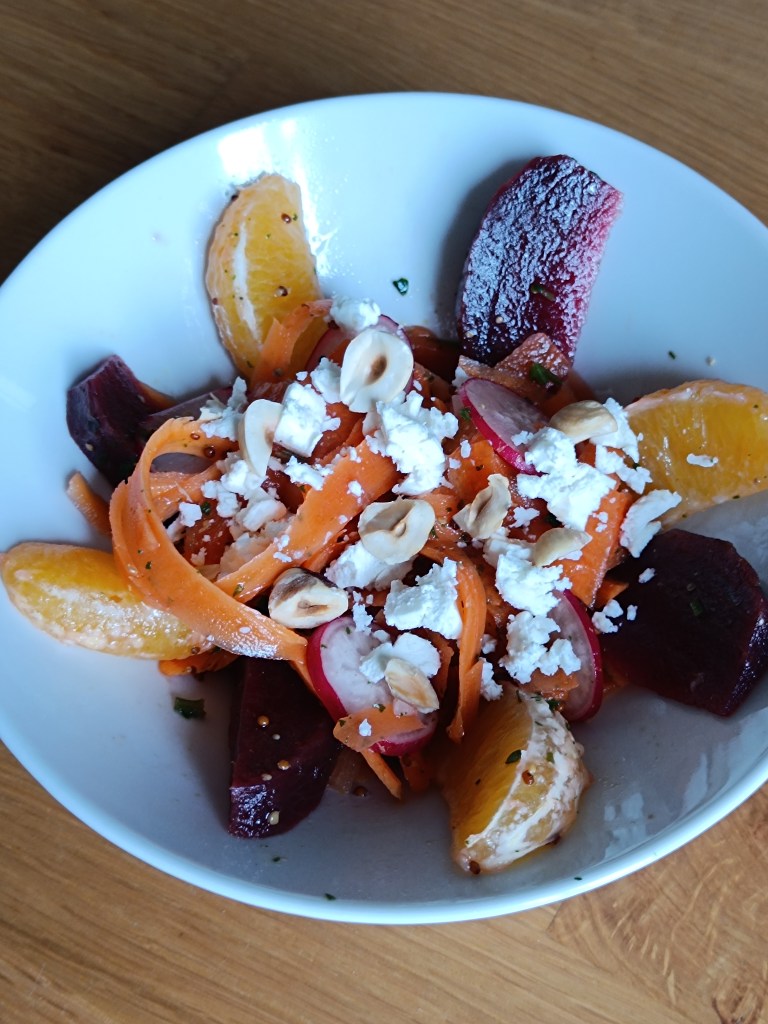 Dans un grand saladier, réunissez la betterave, l’orange, les carottes et les radis. Arrosez de vinaigrette et mélangez délicatement.