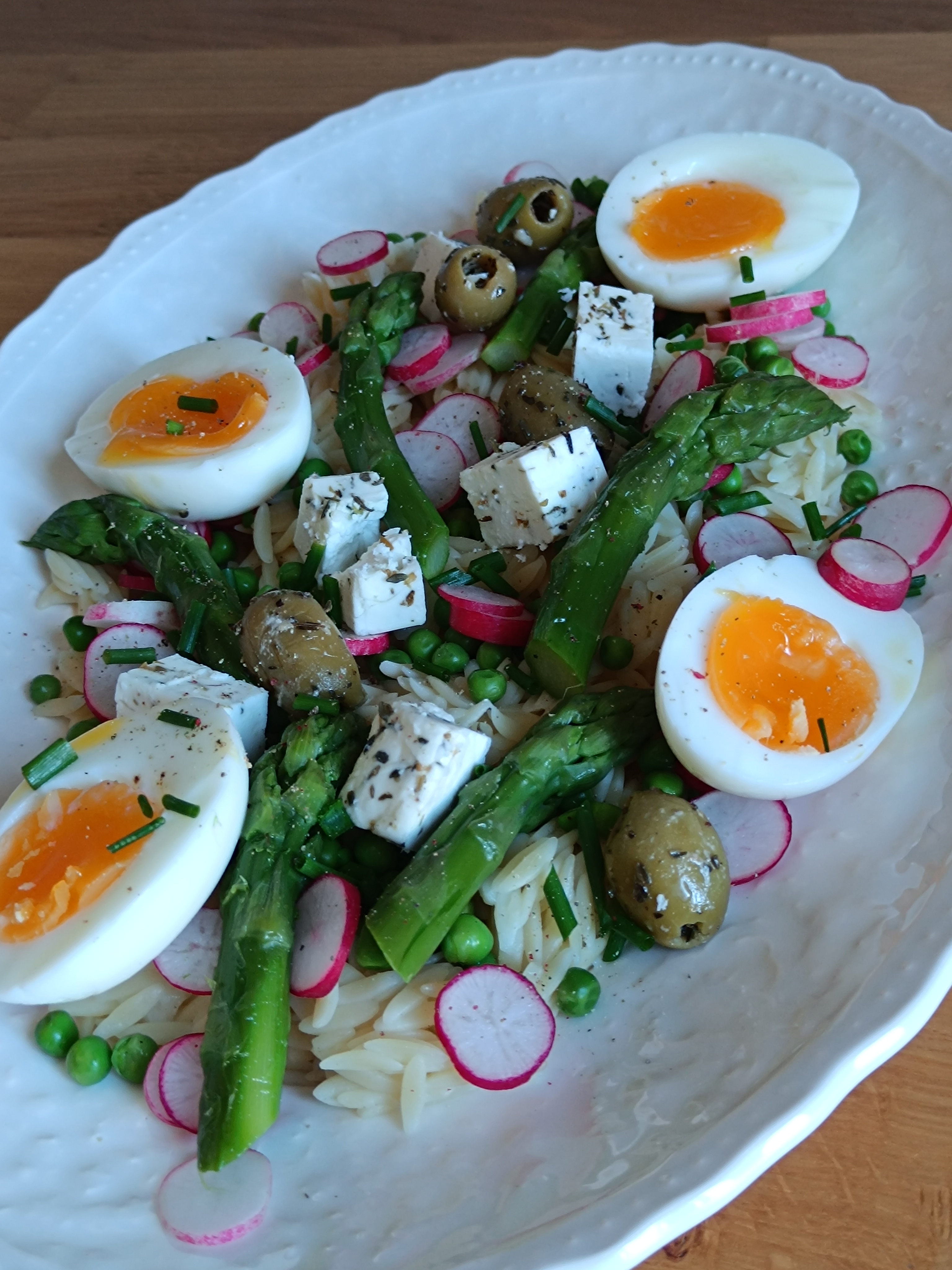 Dans un grand saladier, mélangez l’orzo, les asperges, les petits pois, les radis et les olives vertes. Émiettez la féta au thym par-dessus.