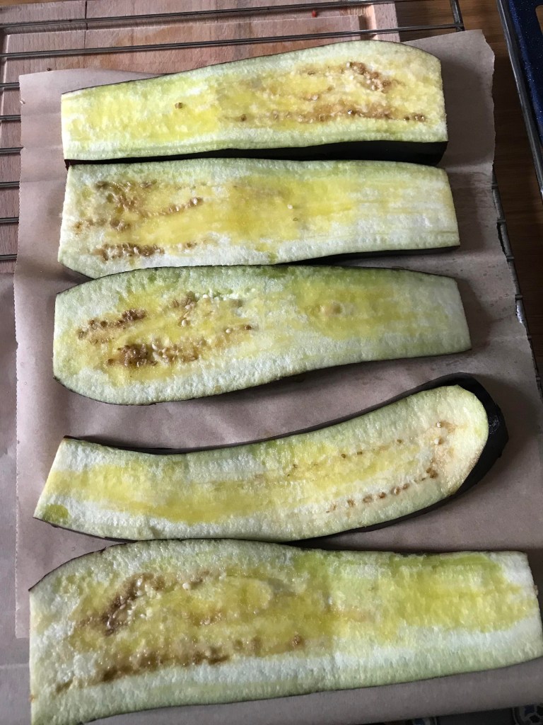 Disposer les aubergines sur une plaque de cuisson et les badigeonner grossièrement d’huile d’olive. (sur 1 seule face)