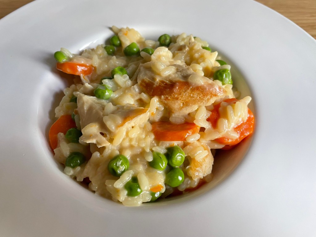 • 200g de riz à risotto • 2 cuillères à soupe d’huile d’olive • 3 filets de poulet • 1 oignon jaune • Branches de Thym • Feuilles de laurier • 6 carottes • 100g de petits pois surgelés