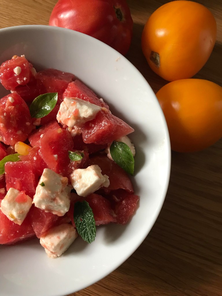 4. Découper les tomates en quartier, ajouter le tout dans le saladier avec la roquette et la feta émiettée dans le saladier. Pressez le citron et ajoutez 1/2 cu. à soupe d’huile d’olive/personne et du vinaigre balsamique.