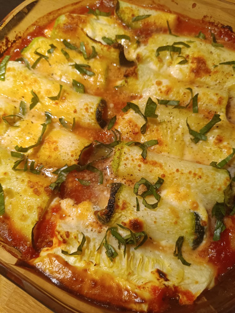 Superposer 3 lamelles de courgette, déposer à la base 2 cuillères à soupe de ricotta et rouler. Déposer le rouleau dans le fond du plat à gratin. Répéter l’opération puis faire cuire environ 20 minutes.